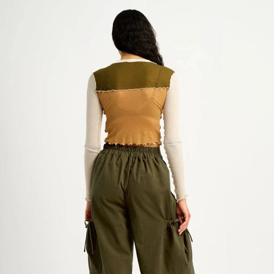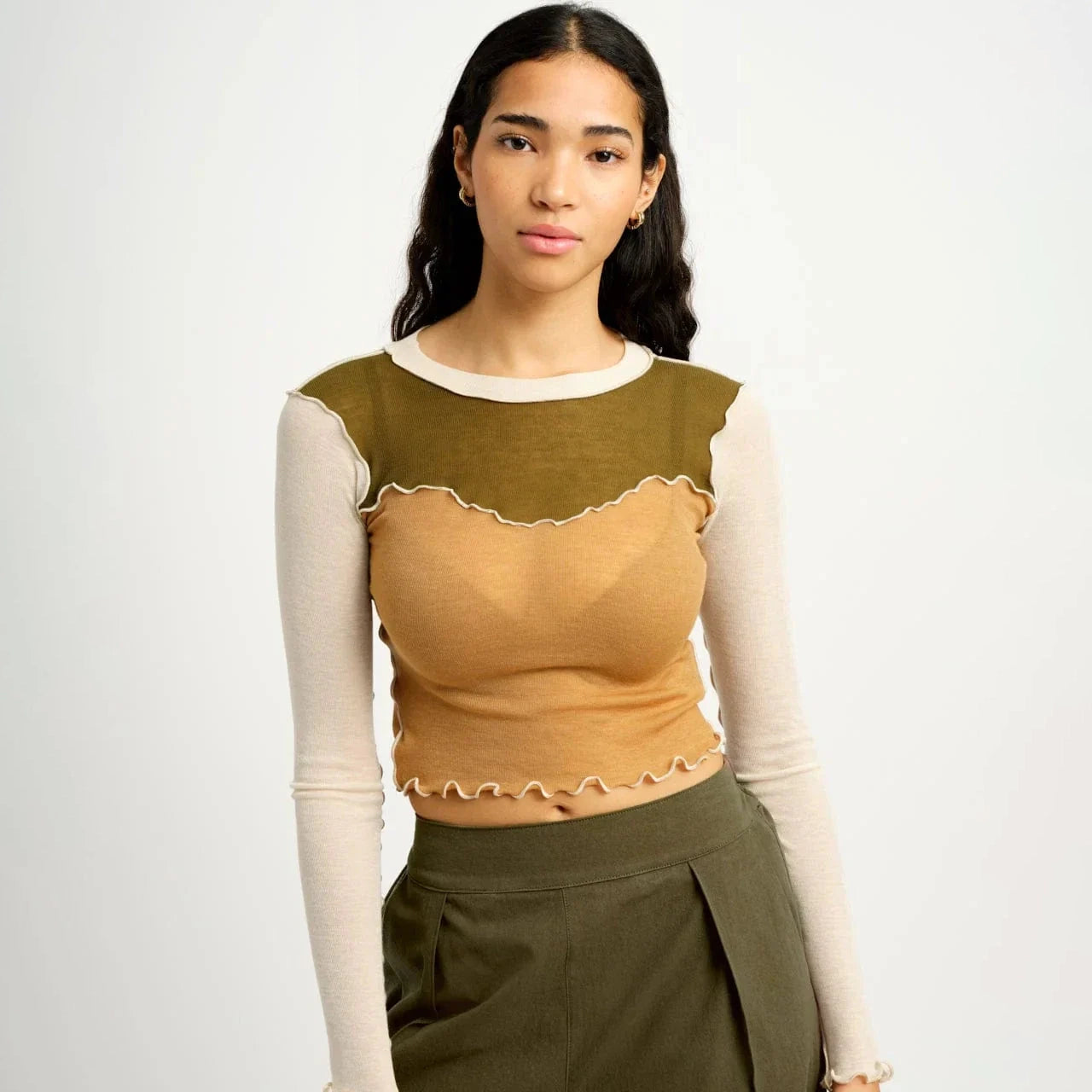 An elevated thermal long sleeve, the Bella top in khaki is a colour blocked mock neck tee that has contrasting merrow edge seams and a bold wave detail on the front and back. This top easily makes a statement on its own but is so light and warm that we highly recommend layering it under dresses, sweaters, and jackets of all kinds!