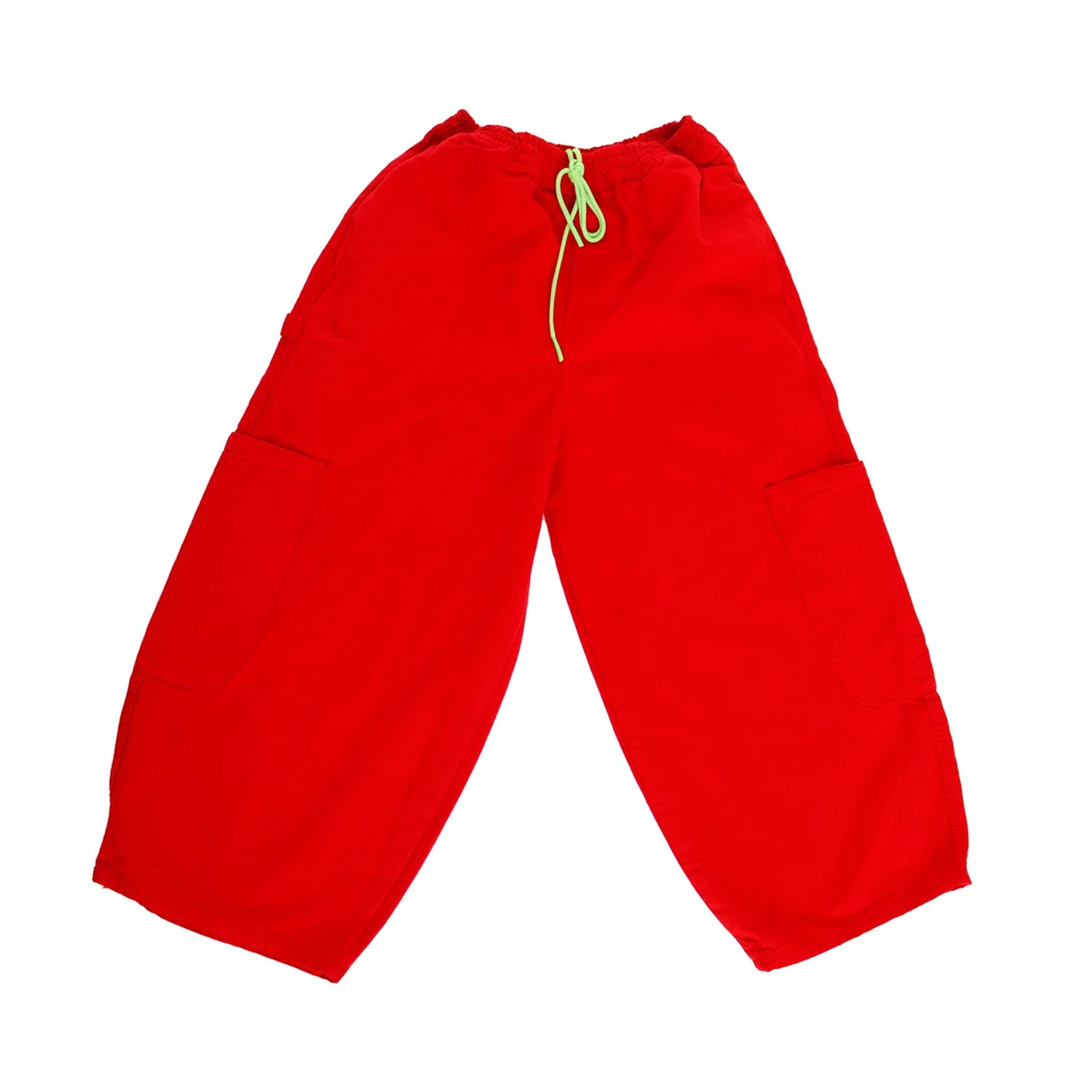 Cropped pants with 5 massive pockets. Elastic waist + drawstring.