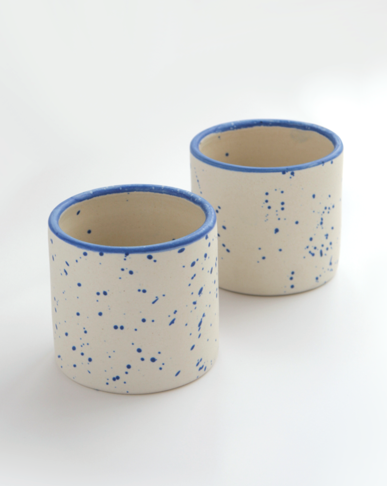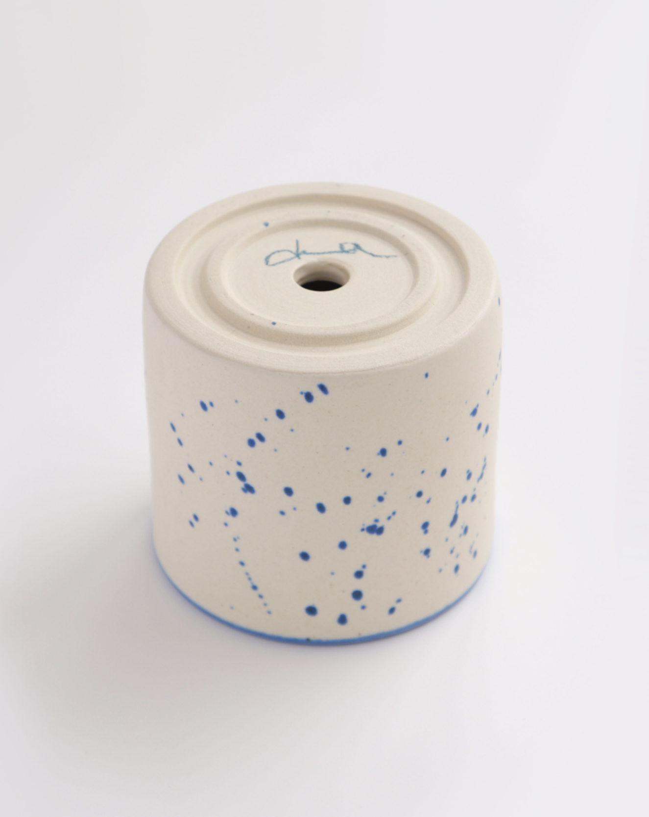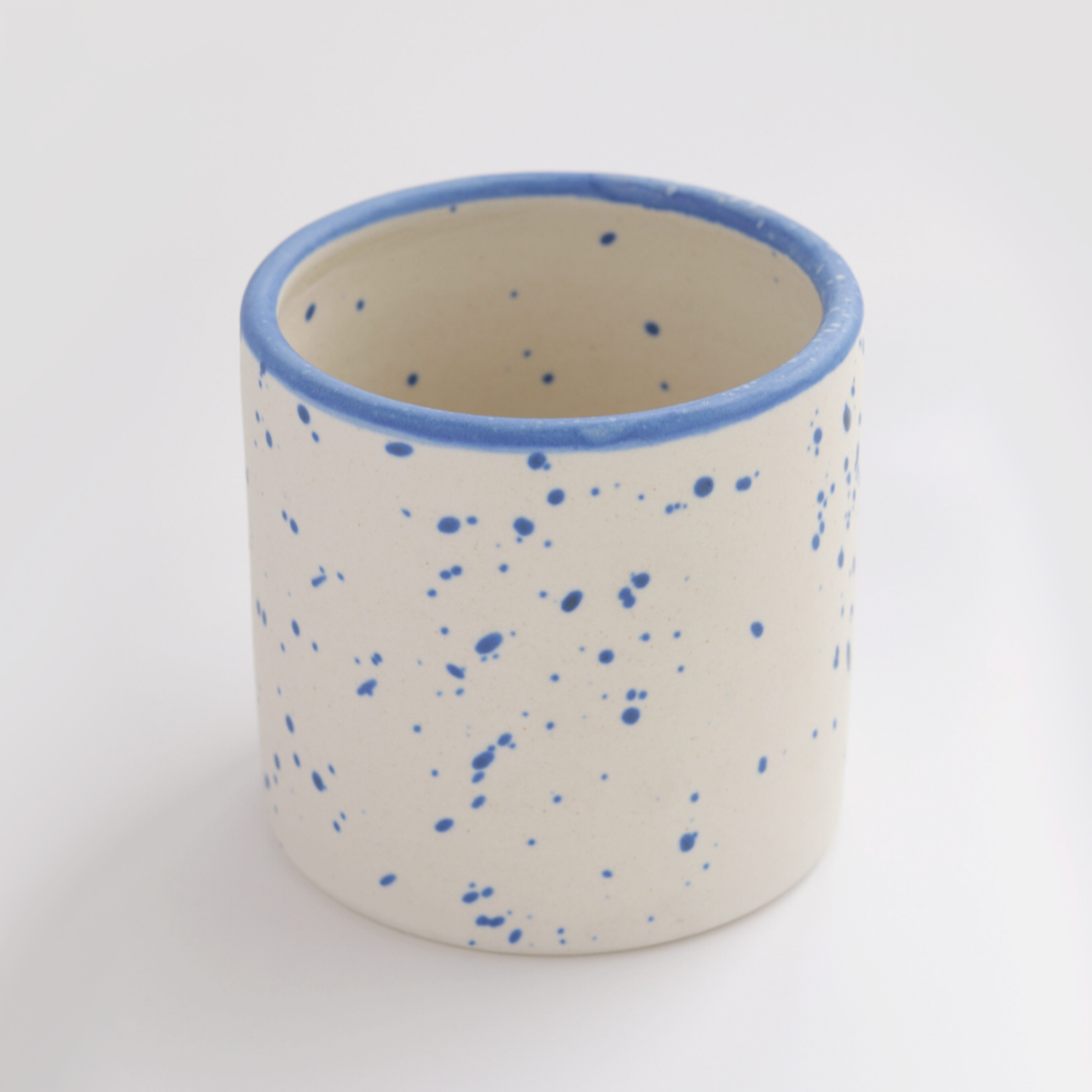 Small planter featuring draining hole in bottom. White ceramic with blue speckle and blue rim.