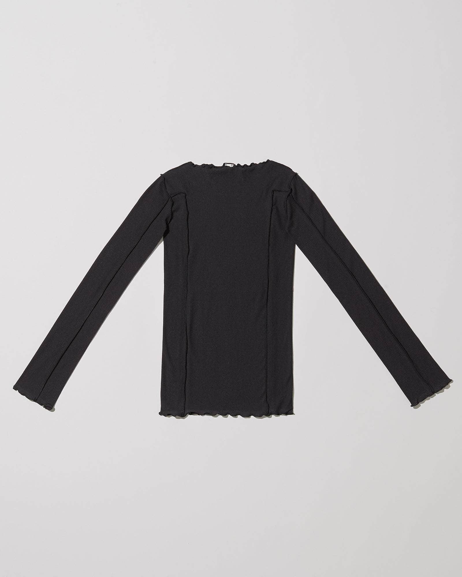 Fine cotton rib, boatneck long sleeve tee with exposed seams and lettuce edging at the neckline and hems.