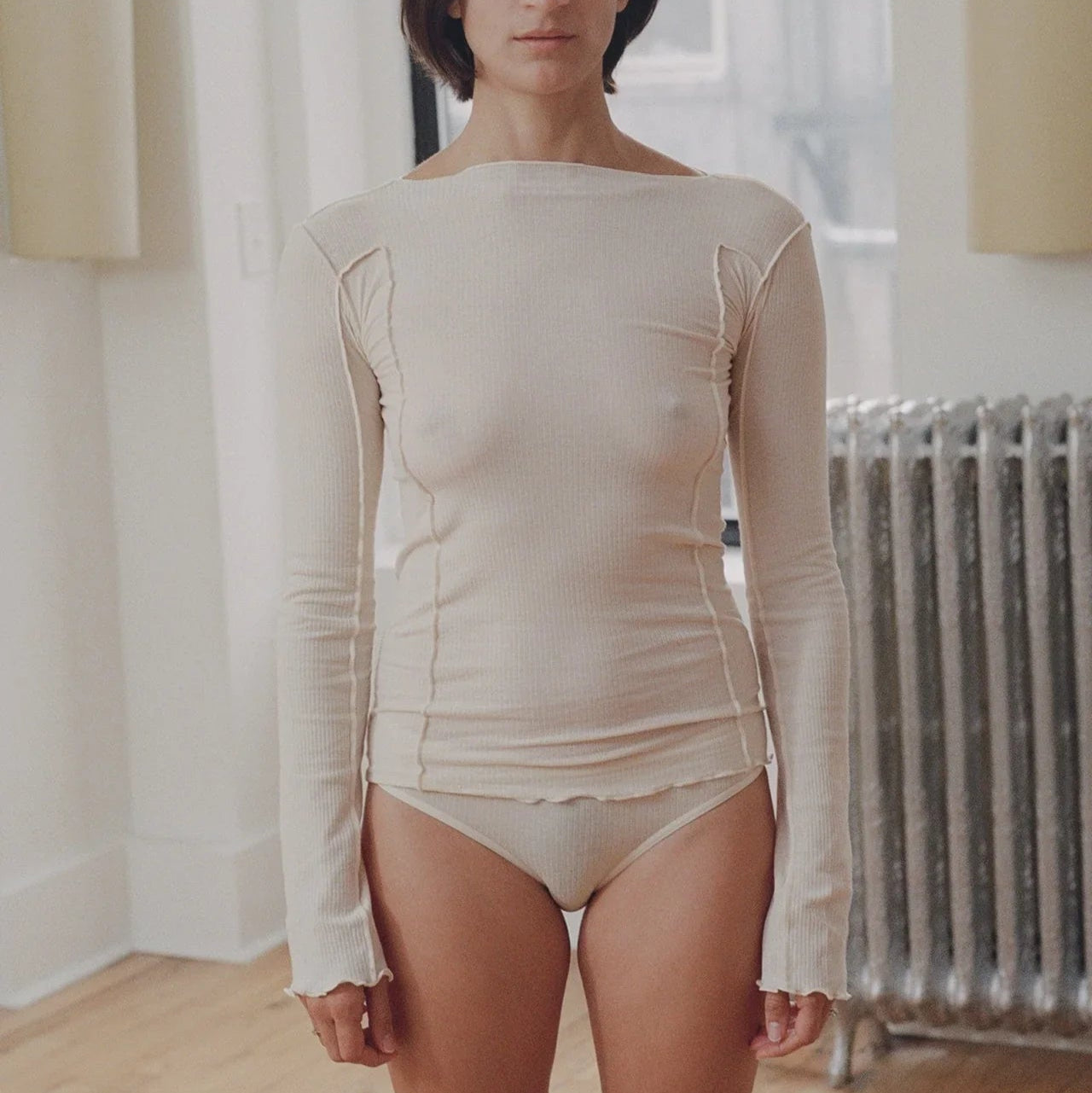Organic boatneck cotton rib long sleeve tee with exposed seams, ledge edge at neckline and hems.